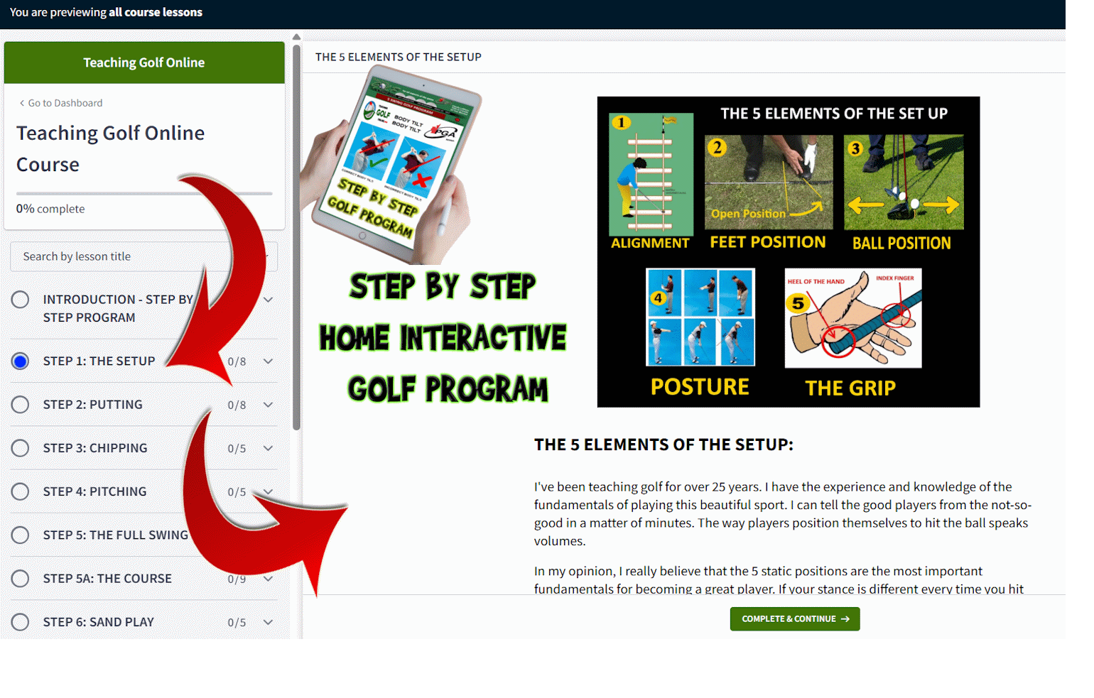 Explore our "Step-by-Step Golf Program," showcasing over 50 concise online lessons, each accompanied by images, text, animations, and videos, all crafted to enhance your skills and elevate your game.